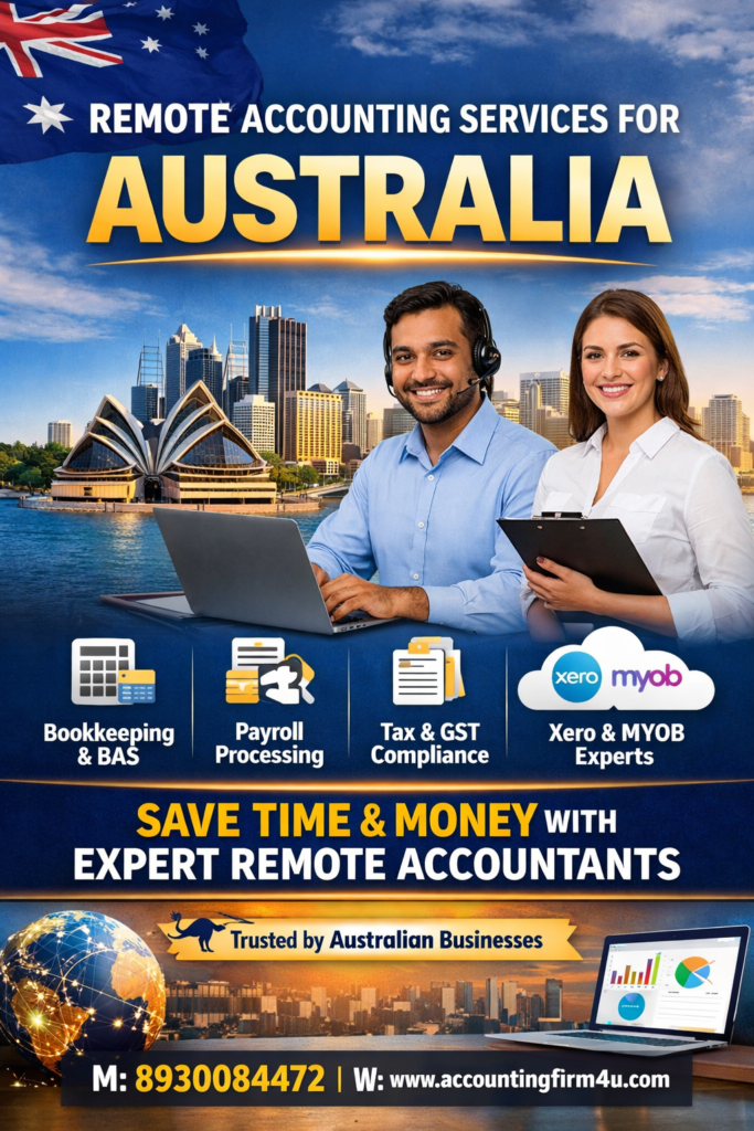 Remote accounting services involve outsourcing accounting, bookkeeping, payroll, taxation, and compliance tasks to professional accountants working from a different location—often overseas—while following Australian accounting standards and tax laws.